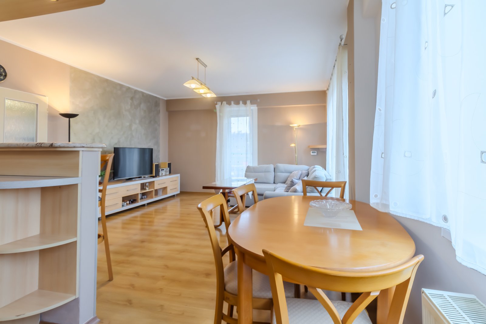působí vzdušně a přirozeně propojuje společenskou část bytu. Bez